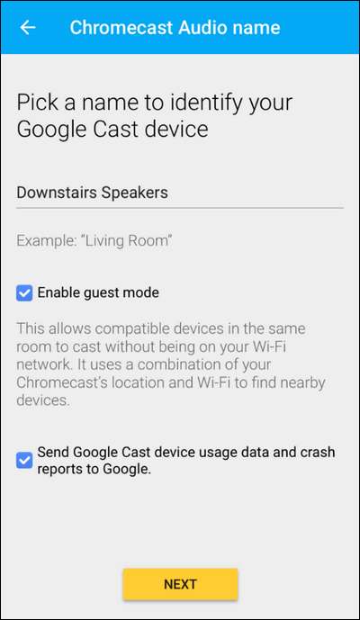 לאחר מכן תתבקש לתת שם ל- Chromecast Audio שלך ולבחור להפעיל את מצב האורח או לא (אם אינך מכיר את מצב האורח של Chromecast, תוכל קרא את זה כאן ). למרות שהאפליקציה מבקשת ממך להשתמש בשם כמו "סלון", מכיוון שכבר יש לנו כמה יחידות Chromecast רגילות עם שמות כאלה בחרנו לקרוא ל- Chromecast Audio שלנו "רמקולים למטה". תן ל- Chromecast שלך שם שניתן לזהות אותו בקלות המבדיל אותו מיחידות אחרות (וזכור שבכל פעם שמישהו נותן למכשיר רשת שם שטותי, מלאך מאבד כנפיים).