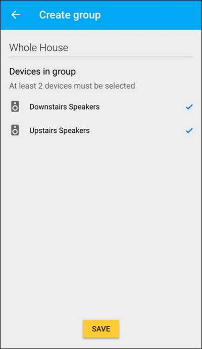 תן לקבוצה שלך שם ובחר את יחידות ה- Chromecast שירכיבו את הקבוצה. בדוגמה שלנו, יש לנו שתי יחידות Chromecast Audio ושמנו את הקבוצה "בית שלם". אם רכשתם יחידות נוספות, תוכלו לחלק את הדברים בקלות לקבוצות כמו "בית שלם", "למעלה", "למטה", ואפילו "בחוץ". כל עוד כל קבוצה מסוימת מכילה שני מכשירי Chromecast, היא תפעל. לחץ על "שמור" בסיום שמות הקבוצה שלך ובחירת המכשירים.
