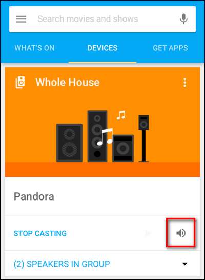 אם אתה רוצה שליטה פרטנית יותר, עם זאת, הפתרון הטוב ביותר שלך הוא להפעיל את אפליקציית Google Cast ולבדוק את הערך של קבוצת הרמקולים, כפי שנראה למטה. אמנם הערך "הפסק ליהוק" ברור מספיק, אך אתה יכול להקיש על סמל הרמקול כדי לשלוט ברמקולים.