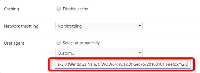 אם יש סוכן משתמש ספציפי שאתה רוצה להשתמש בו אינו מופיע בתפריט הנפתח, תוכל להעתיק ולהדביק אחד מותאם אישית בשדה הטקסט שמתחתיו.
