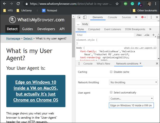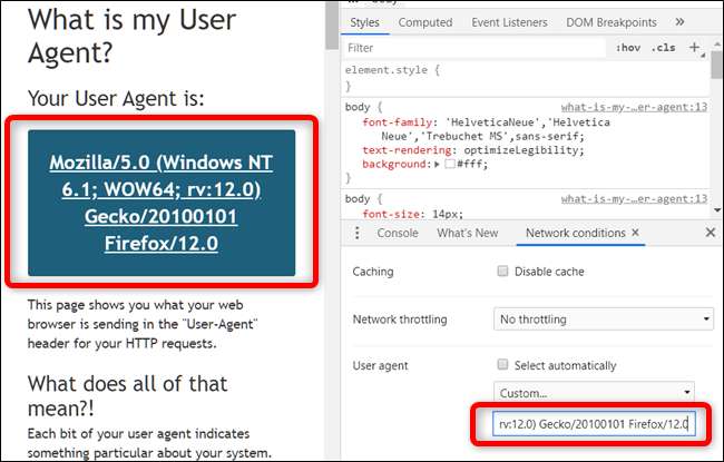 לאחר מכן - כאשר חלונית כלי המפתח עדיין פתוחה בכרטיסייה הנוכחית - עבור לכל אתר, וסוכן המשתמש מוגדר לזה המותאם אישית שציינת עד שתסגור את כלי המפתח.
