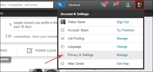 הצעד הראשון שלך פונה אל הגדרות LinkedIn שלך. על העיקרי לינקדאין לחץ על תמונת הפרופיל שלך ובחר "פרטיות והגדרות".