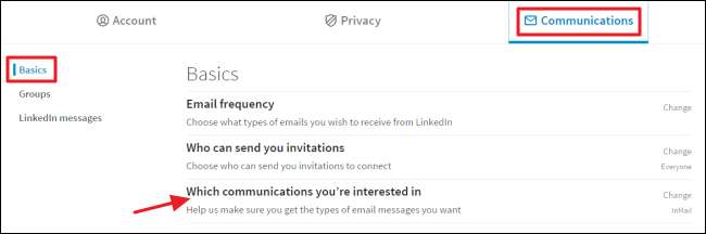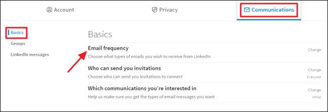 בדף ההגדרות של לינקדאין, עבור לכרטיסייה תקשורת ואז בחר בסעיף היסוד "תדירות דוא"ל". שים לב שבעוד שאנחנו רק מדברים כאן על הודעות דוא"ל, דף בסיסי זה גם נותן לך שליטה מסוימת מי יכול לשלוח לך הזמנות רשת והאם בכלל תקבל הזמנות קבוצתיות.