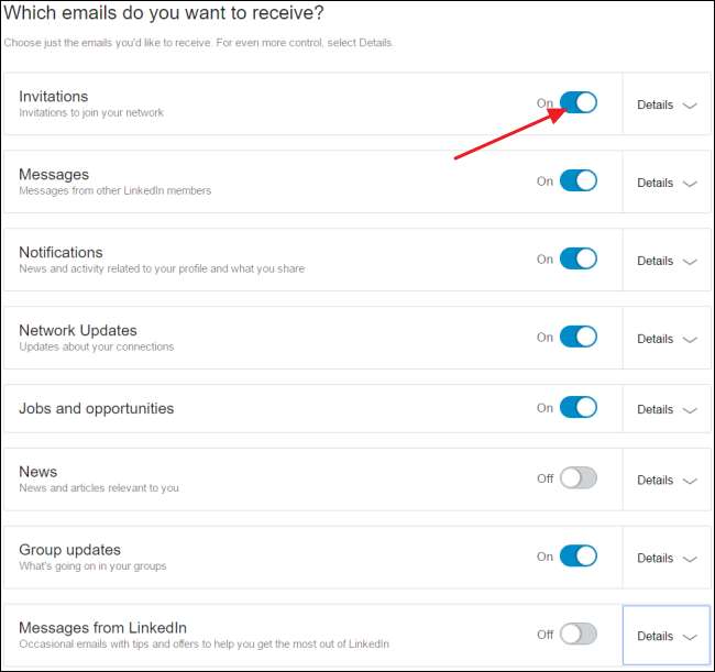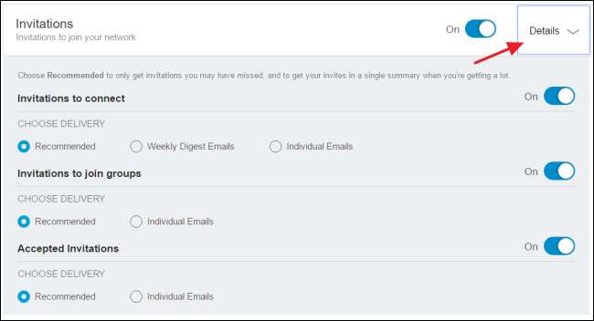 אתה יכול להפעיל שליטה עדיפה עוד יותר על הודעות דוא"ל עבור קטגוריה מסוימת. לדוגמה, אולי אתה רוצה לקבל הודעות דוא"ל על הזמנות להצטרף לרשת של מישהו, אך לא על הצטרפות לקבוצות. פשוט לחץ על כפתור הפרטים לצד קטגוריה כדי לראות מה אתה יכול לעשות איתו.