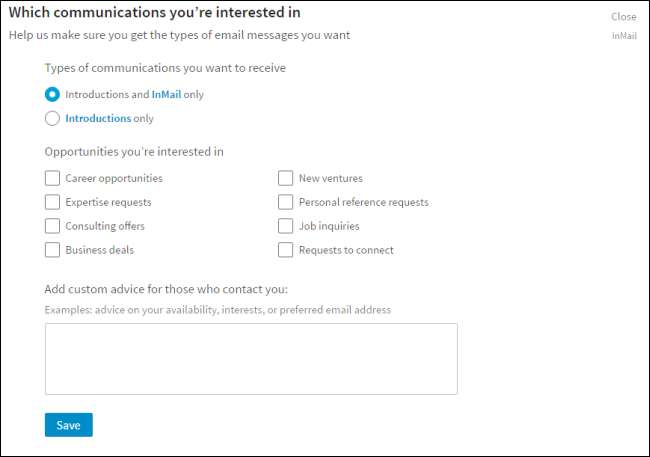 למרבה הצער, אתה נאלץ לקבל הודעות דוא"ל על היכרות. האפשרויות היחידות שלך כאן הן לקבל הודעות על היכרות סתם או לקבל הודעות בכל פעם שמישהו שולח לך הודעת InMail. אתה יכול גם לבחור מספר הזדמנויות שאנשים רשאים לשלוח לך הודעות לגביהן ואף להוסיף הערה לאנשים שרוצים ליצור איתך קשר. לאחר שבחרת, לחץ על שמור.