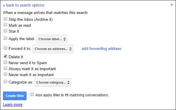 לאחר מכן, פשוט הגדר את המסנן כדי למחוק (או, אם אתה מעדיף, להעביר לארכיון) כל דוא"ל שתואם לכלל זה.