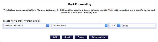 זה אפשרי, אבל קצת יותר מסובך: תצטרך לצלול לתצורת הנתב שלך ולהגדיר העברת יציאות. אתה צריך את הנתב שלך כדי להפנות את כל הבקשות ללקוח האינטרנט של NextPVR למרכז המדיה שלך. כיצד לעשות זאת ישתנה מאוד בהתאם לנתב שלך, אך המדריך שלנו להגדרת העברת יציאות בנתב שלך מציע סקירה מעולה. רק וודא שאתה מעביר את 8866, או את היציאה שבחרת עבור ממשק המשתמש של NextPVR בשלב הראשון, לכתובת ה- IP של HTPC שלך.