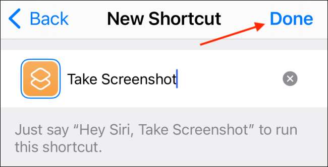 תן לקיצור שם (הלכנו עם "לקחת מסך" עבור שלנו.) ולאחר מכן הקש על הלחצן "Done".