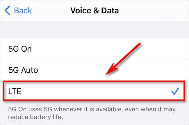 ב "קול & AMP; נתונים, "בחר" LTE "מהרשימה כדי להשבית 5G לחלוטין.