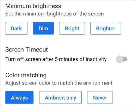 בזמן שאתה כאן, קח דקה כדי לבדוק את הגדרות התצוגה האחרות. אתה יכול להתאים את "בהירות Minumum", "פסק זמן מסך", "התאמת צבע".