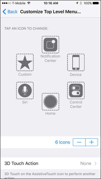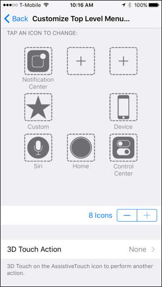 אין מספיק כפתורים בתפריט AssistiveTouch? אתה יכול להוסיף עוד שניים בסך הכל 8 על ידי הקשה על סמל "+" למטה, או שאתה יכול להקטין את המספר על ידי הקשה על הסמל "-".