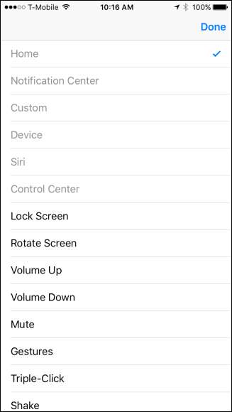 המפתח הוא התכונה AssistiveTouch של iOS, שאותה יש לנו שהוזכר קודם . AssistiveTouch פועל על ידי הצבת כפתור קטן על מסך הבית. כשתקיש עליו, יופיע תפריט שימושי המאפשר לך לגשת לפעולות המופעלות בדרך כלל באמצעות מחוות או כפתורים.