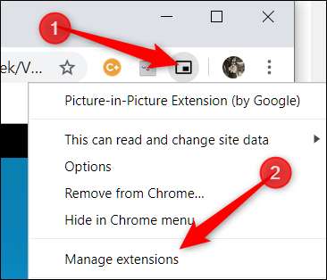 כדי שהסיומת PiP של גוגל תעבוד עם קבצים המאוחסנים באופן מקומי במחשב שלך, עליך להעניק הרשאה לתוסף לגשת לכתובת האתר של הקובץ. לחץ לחיצה ימנית על סמל התוסף שנמצא בסרגל הכלים ואז בחר "נהל תוספים".