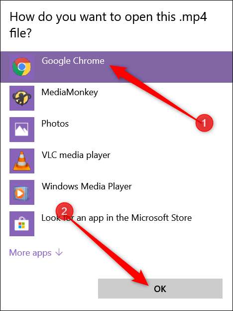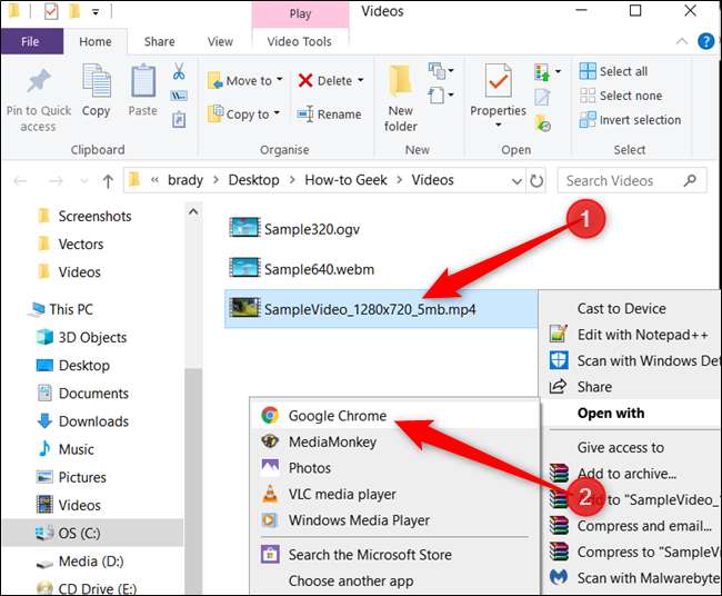 לאחר מכן, נווט לתיקיית הסרטון שברצונך לצפות בו ב- Chrome. לחץ באמצעות לחצן העכבר הימני על הסרטון, הצבע על "פתח באמצעות" ואז לחץ על "Google Chrome".