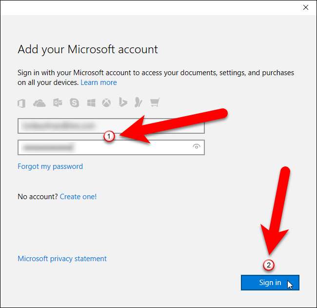 אם יצרת במקור את חשבון Windows 10 שלך כחשבון מקומי, תיבת הדו-שיח הוסף את חשבון Microsoft שלך תוצג. אם אין לך חשבון Microsoft, לחץ על "צור חשבון" ופעל לפי ההוראות בתיבת הדו-שיח. אחרת, הזן את כתובת הדוא"ל והסיסמה של Microsoft בתיבות ולחץ על "היכנס".