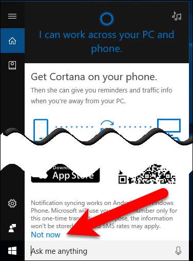 לאחר שתיכנס, Cortana עשויה לנסות לשכנע אותך להשיג את Cortana בטלפון שלך. אם אינך רוצה לעשות זאת כרגע, לחץ על "לא עכשיו" בתחתית חלונית Cortana.