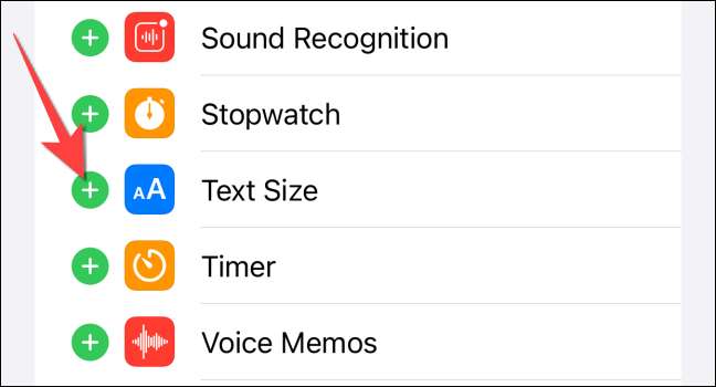 גלול למטה תחת סעיף "פקדים נוספים" עד שתראה את האפשרות "גודל טקסט". לאחר מכן, בחר ירוק לחצן פלוס כדי להוסיף אותו לרשימת "בקרות כולל".