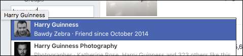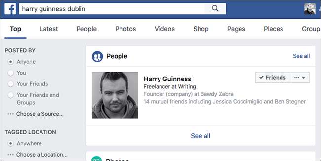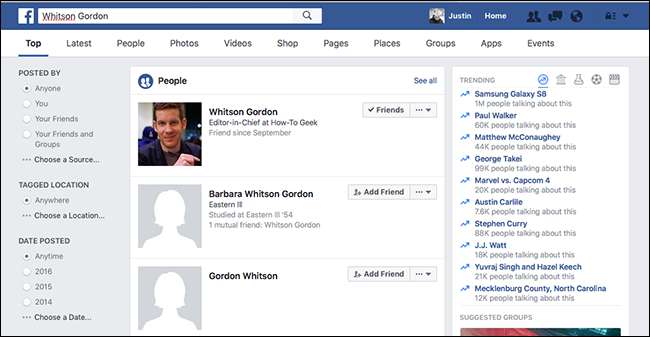 השימוש הברור ביותר בפונקציונליות החיפוש של פייסבוק הוא חיפוש אנשים, אז בואו נתחיל בזה. פשוט הקלד את שם האדם שאתה מחפש ותראה רשימת תוצאות: