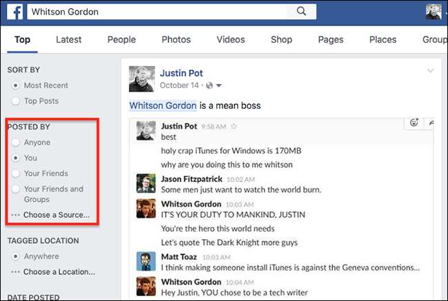 האם אי פעם מצאת את עצמך מנסה למצוא בפוסט או שיחה ספציפיים בפייסבוק מלפני כמה חודשים ואפילו שנים? החיפוש של פייסבוק יכול לעזור בכך. פשוט הקלד כמה מילות מפתח מהשיחה לחיפוש, ואז לחץ על אחד מכפתורי "פורסם על ידי" בעמודה השמאלית.