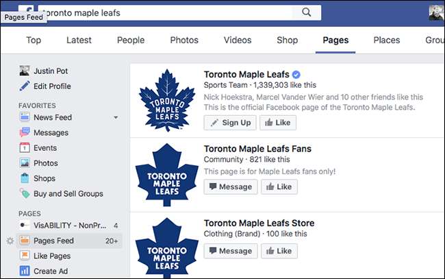 רואים את הסימן הכחול ההוא לצד שם הדף? זה אומר שזה דף רשמי. אם ברצונך למצוא כמה דפים לא רשמיים שתאהב גם כן, לחץ על הכרטיסייה "דפים" מעל לתוצאות החיפוש.