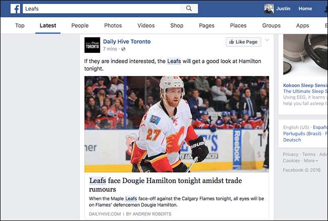 פייסבוק כנראה לא מקום נהדר לקבל בו חדשות , אך הכרטיסייה "אחרונה" תציג לך חבורה של פוסטים אחרונים הקשורים לשאילתת החיפוש שלך.