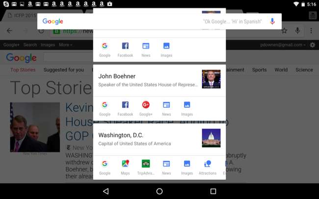 עכשיו ב- Tap מרחיב את זה עוד יותר. אפליקציות Android יכולות לחשוף את הנתונים שלהם ל- Now on Tap. כשאתה פותח את Now on Tap, הוא סורק את המסך לאיתור מידע שאולי תרצה לדעת עליו יותר ומציע "כרטיסים" רלוונטיים.