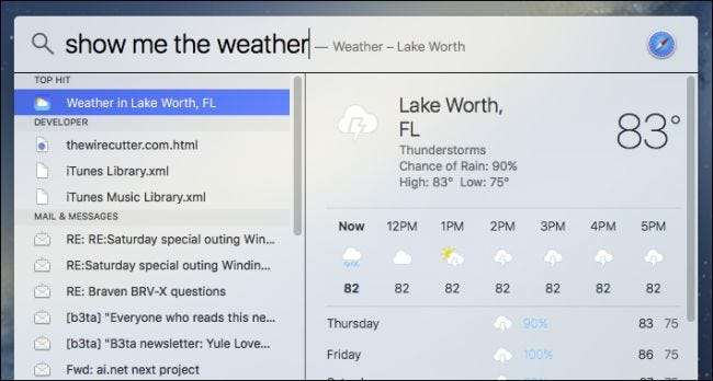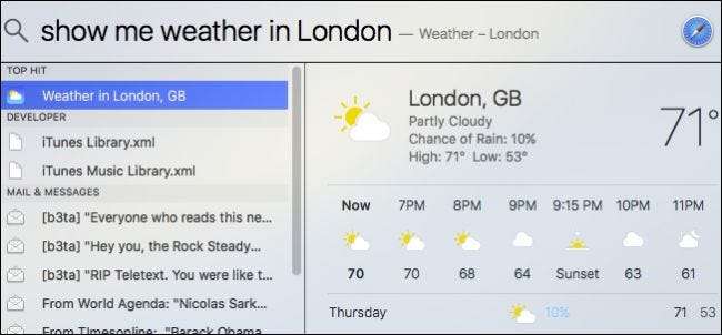 לפני שתתחיל לחפש באופן טבעי, אנו רוצים להסביר מה עדיין זרקור לא יכול לַעֲשׂוֹת. זרקור אינו יכול לחפש באינטרנט, אם כי הוא יכול להתחבר לוויקיפדיה, פנדנגו, מזג אוויר ומידע רלוונטי אחר. יתר על כן, הוא לא יכול להוסיף פגישות ליומן שלך או לחפש באנשי הקשר שלך. זרקור קשור למיקום ה- Mac שלך, ולכן הוא משמש בצורה הטובה ביותר לחיפוש תוכן מקומי ולקבצים הכלולים בו.