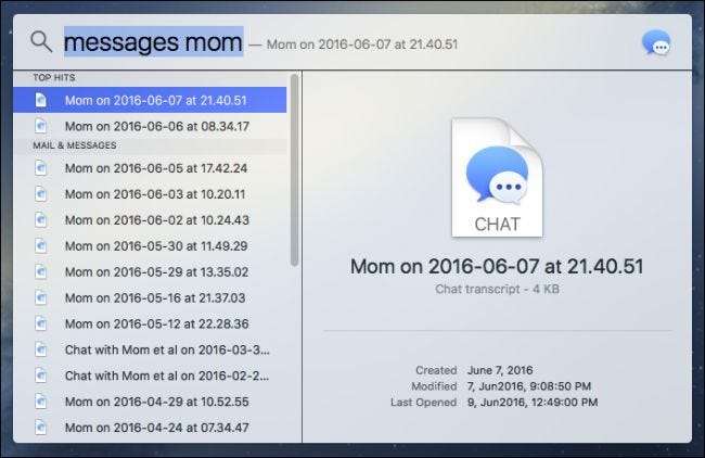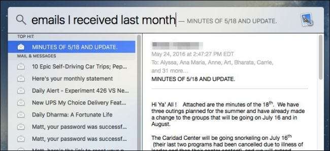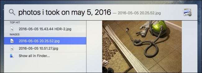 כפי שניתן לראות מדוגמה קודמת, אתה יכול לבקש מ- Spotlight לחפור בנתונים שלך באמצעות תאריכים.