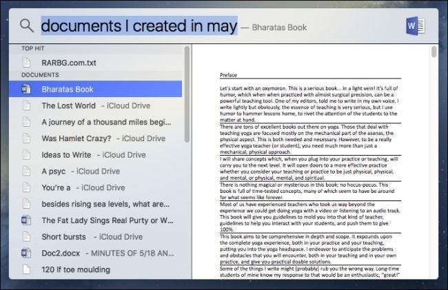אתה יכול לקחת את זה עוד יותר, ולעשות דברים ספציפיים עוד יותר. נניח שאתה רוצה לראות את כל המסמכים שיצרת במהלך חודש מאי. שילוב של הכינוי האישי "אני" עם מה שאתה מחפש, אתה יכול פשוט לשאול את זרקור "מסמכים שיצרתי במאי" ותראה רשימה, כמתבקש.