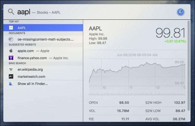 כנ"ל לגבי דברים כמו מידע על מניות: אתה יכול פשוט להזין את קיצור התיקים של החברה.