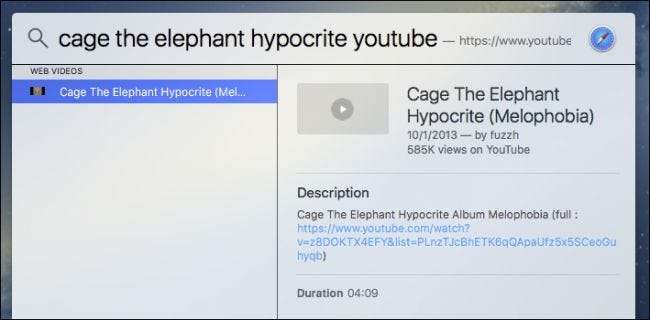 למרבה הצער, המידה בה זרקור יכול לבצע טריקים מוגבלת למדי. לדוגמה, בזמן שאתה יכול לחפש סרטונים ב- YouTube וכן הלאה, אתה לא יכול לצפות בתצוגה מקדימה ב- Spotlight או אפילו בשולחן העבודה של ה- Mac שלך. במקום זאת, כאשר תלחץ על תוצאת חיפוש, היא תיפתח במקום זאת בחלון דפדפן.