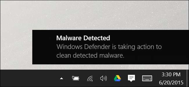 אתה בכלל לא באמת צריך לחשוב על Windows Defender. זה יופיע רק כדי ליידע אותך כאשר הוא ימצא תוכנה זדונית. זה אפילו לא ישאל אותך מה אתה רוצה לעשות עם התוכנה הזדונית שהיא מוצאת - זה פשוט מנקה את הדברים ו הסגרים את הקבצים באופן אוטומטי.
