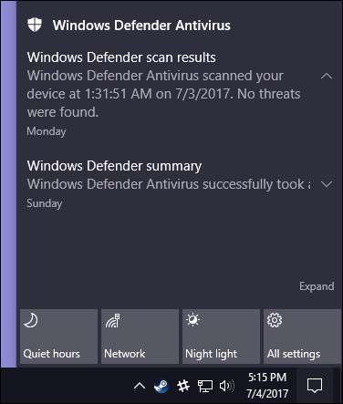 מדי פעם תראה חלון קופץ להודעות כדי ליידע אותך מתי בוצעה סריקה, ובדרך כלל תוכל לראות את פרטי הסריקה האחרונה על ידי פתיחת מרכז הפעולות ב- Windows 10.