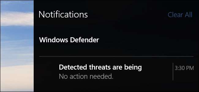 אם Windows Defender אכן ימצא איום, תראה גם הודעה שתודיע לך שהוא נוקט בפעולה כדי לנקות את האיומים האלה - ולא נדרשת ממך שום פעולה.