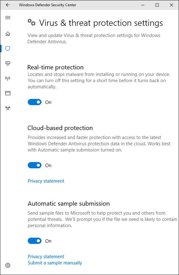 כדי להפעיל או להשבית אחת מההגדרות הללו, לחץ על הקישור "הגדרות הגנה מפני וירוסים ואיומים" בכרטיסייה הראשית "Windows Defender".