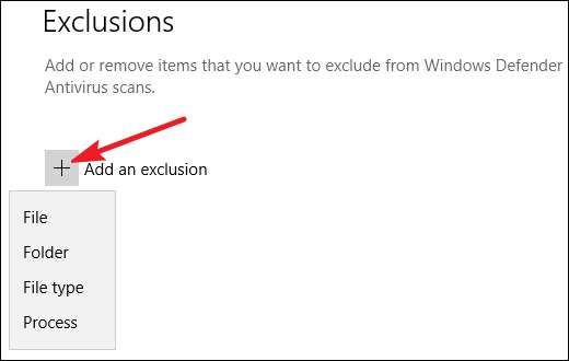 כדי להוסיף אי הכללה, לחץ על הלחצן "הוסף אי הכללה", בחר את סוג ההדרה שברצונך להוסיף מהתפריט הנפתח ואז הכוון את Windows Defender לכל מה שאתה רוצה לא לכלול.