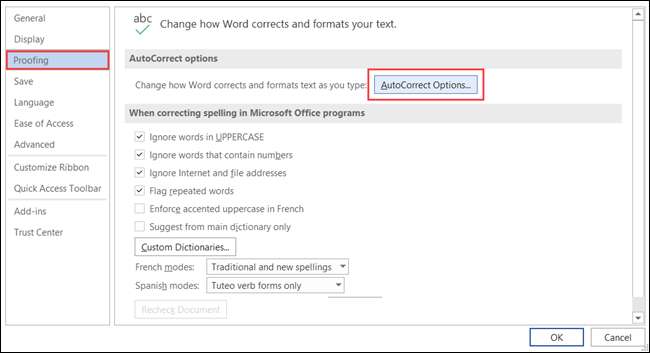 בחר "הגהה" בצד ימין ולחץ על "אפשרויות תיקון שגיאות אוטומטי" בצד ימין.