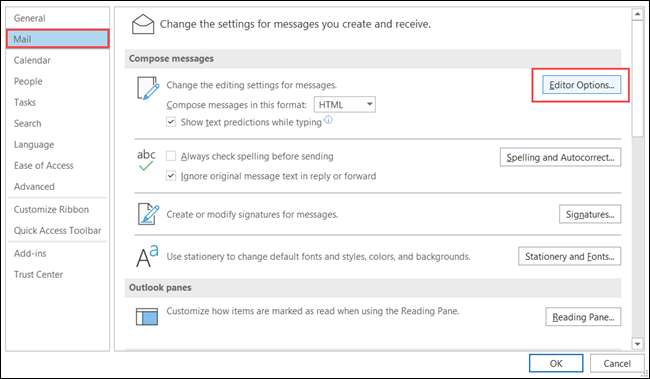 בחר "דואר" בצד ימין ולחץ על "עורך אפשרויות" בצד ימין.