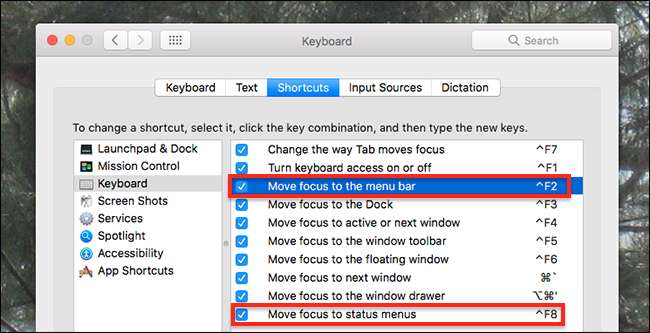 שינוי "העבר מיקוד לשורת התפריטים" ישנה את קיצור הדרך להפעלת תפריט היישום שלך; "העבר את המיקוד לתפריטי הסטטוס" ישנה את קיצור הדרך להפעלת סמלי שורת התפריטים שלך.