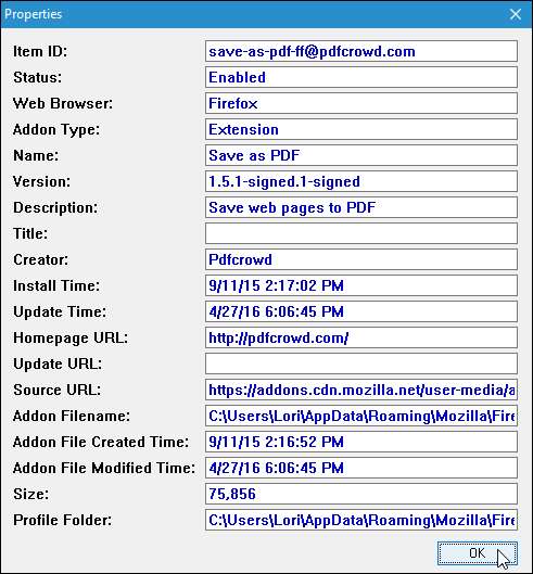 תיבת הדו-שיח מאפיינים מציגה את כל אותו מידע כמו העמודות בחלון התוכנית הראשי. מה שימושי בתיבת הדו-שיח מאפיינים הוא שאתה יכול לבחור ולהעתיק את המידע. לדוגמא, אם ברצונך לעבור לדף הבית של התוסף, תוכל לבחור את ערך כתובת ה- URL של דף הבית ולהדביק אותו בשורת הכתובת בדפדפן שלך. לחלופין, תוכל להעתיק את הנתיב לתיקיית הפרופיל ולהדביק אותו בסייר הקבצים כדי לגשת לפרופיל שבו מותקנת הסיומת. עם זאת, יש דרך קלה יותר לפתוח את תיקיית הפרופיל המתאימה עבור סיומת, אותה נציג בפניך בהמשך. לחץ על "אישור" כדי לסגור את תיבת הדו-שיח מאפיינים.