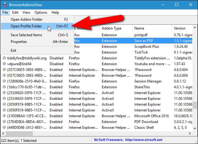 BrowserAddonsView אומר לך באיזה דפדפן מותקנת כל סיומת. אבל מה אם יש לך מספר פרופילים ב- Chrome וב- Firefox? בנוסף לערך תיקיית הפרופיל בתיבת הדו-שיח מאפיינים, כאמור לעיל, תוכל גם לגלות באיזה פרופיל מותקנת סיומת על ידי בחירת התוסף ברשימה ואז בחירה באפשרות "פתח תיקיית פרופיל" מתפריט "קובץ" .