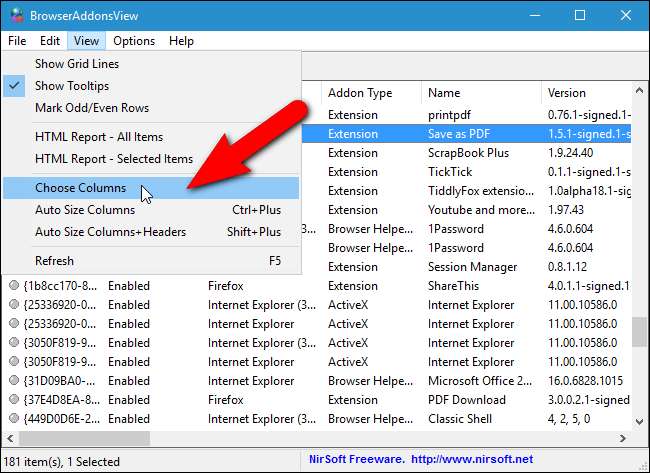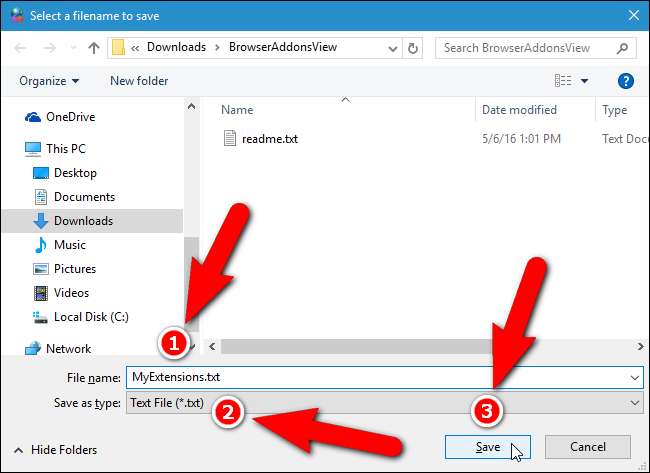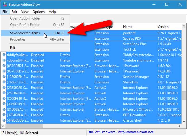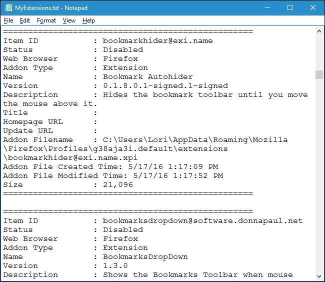 ניתן גם לייצא את הרשימה לקובץ שתוכלו לגבות אותו לעיון עתידי. ההרחבות מתווספות לקובץ כפי שהן מופיעות ב- BrowserAddonsView, לכן אנו נציג מספר דרכים בהן תוכל להתאים אישית את מה שמסתיים בקובץ.