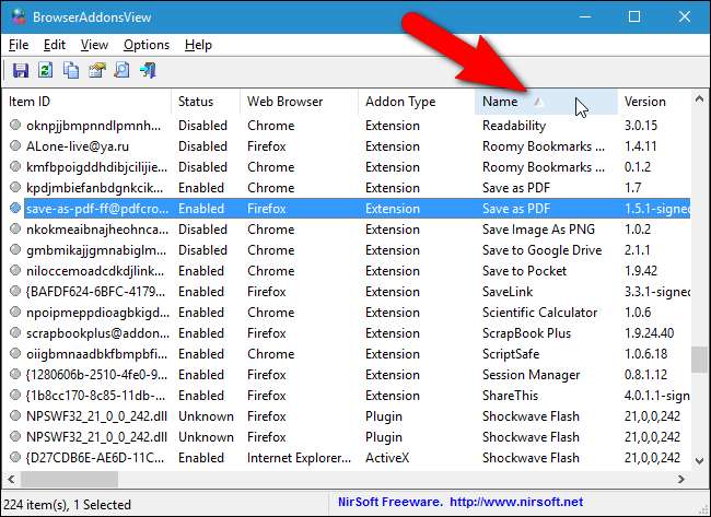 התוספים רשומים בקובץ המתקבל באותו סדר כמו ב- BrowserAddonsView. עם זאת, תוכל לשנות את הסדר על ידי לחיצה על כותרת כדי למיין את כל הפריטים לפי ערך זה. לדוגמא, אם ברצונך להזמין את כל התוספים בקובץ המיוצא לפי שם בסדר עולה, לחץ פעם אחת על כותרת העמודה "שם". חץ מוצג בכותרת העמודה או מצביע למעלה (סדר עולה, למשל A-Z) או מטה (סדר יורד, למשל, Z-A).