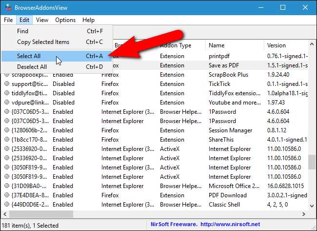 כעת לאחר שהרשימה שלך הוגדרה כפי שאתה רוצה, בחר באפשרות "בחר הכל" מתפריט "ערוך", או הקש Ctrl + A כדי לבחור את כל הפריטים. אם אינך מעוניין לשמור את כל התוספים לקובץ, אתה יכול לבחור מסוימים באמצעות מקשי Shift ו- Ctrl, באותו אופן שאתה עושה בסייר הקבצים (או ב- Windows).