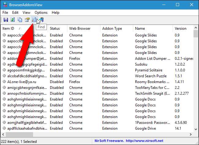 אם יש לך רשימה ארוכה מאוד של הרחבות וברצונך לקבל מידע אודות אחת ספציפית, תוכל לחפש ברשימה. לשם כך לחץ על "מצא" בסרגל הכלים, או לחץ על Ctrl + F.