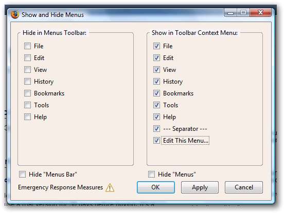 בתפריט לחיצה ימנית המשמשת לעיל, עליך להבחין בפריט חדש בשם תפריטים \ ערוך תפריט זה. אם תבחר בכך, תראה דו-שיח זה שיאפשר לך להציג את התפריטים באמצעות אותו תפריט לחיצה ימנית.