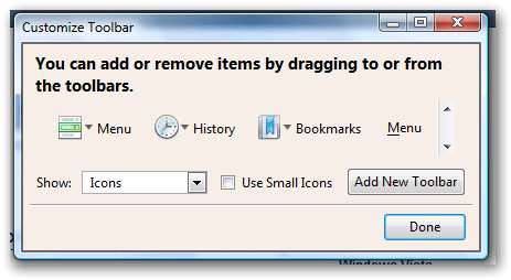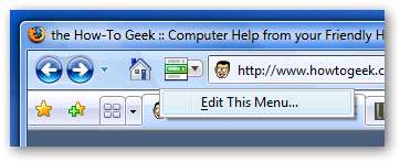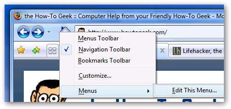 לחלופין, אתה יכול להוסיף כפתור "תפריט אישי" לסרגל הכלים שלך ולהתאים אישית כמה פריטים שנמצאים בשימוש בו. פשוט לחץ לחיצה ימנית על \ התאמה אישית בסרגל הכלים, ובחר את כפתור "התפריט" החדש והמבריק שמוצג בצד שמאל של צילום המסך הזה, וגרור אותו לסרגל הכלים שלך לאנשהו.