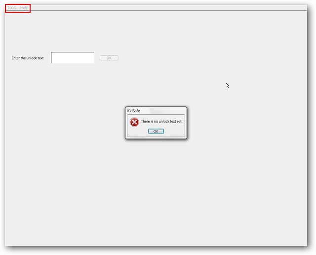 ברגע שהתחלת KidSafe המסך שלך יהיה "מכוסה" בזמן הגדרת התוכנית. שימו לב שיש שני תפריטים (כלים ועזרה) בפינה השמאלית העליונה. הגישה לאפשרויות ב"תפריט הכלים "תדרוש את הסיסמה שתגדיר עבור KidSafe ... אז אל תדאג שילד צעיר פשוט נכנס ומשנה את ההגדרות שלך כדי לקבל כניסה ללא הסיסמה.