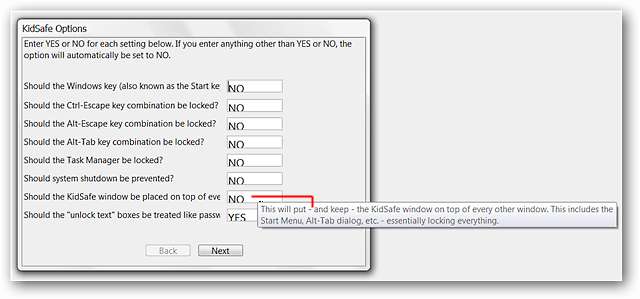 ישנן שלוש אפשרויות / חלונות התקנה עבור KidSafe. כאן בהתחלה אתה יכול לשנות את כל ההגדרות שאתה מרגיש נחוץ למפתחות, שילובי מקשים, גישה למנהל המשימות וכו '. במערכת שלנו בהחלט "נעלנו" את "מקש Windows" מכיוון שזה לא היה שילוב מקשים ...