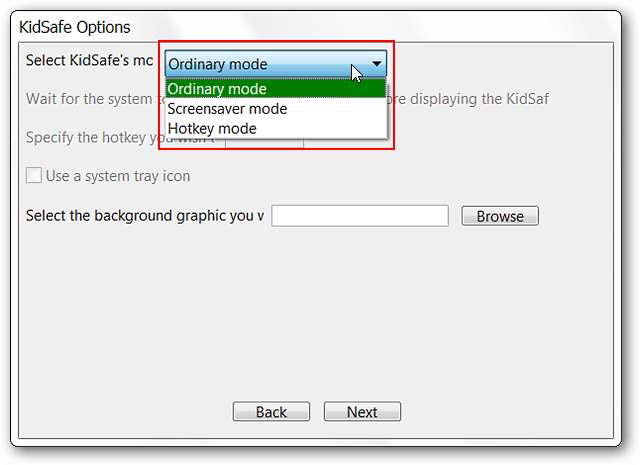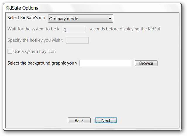 החלון השני יאפשר לכם לבחור את "מצב KidSafe" המתאים ביותר לצרכים שלכם. תוכל גם לבחור רקע טפט ספציפי (פורמט .bmp, .jpg או .png) אם תרצה בכך או לתת ל- KidSafe להשתמש ברירת מחדל (השאר אותו ריק).